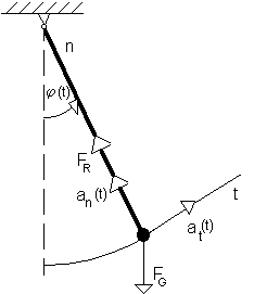 Hmotný bod o hmotnosti m [kg], který se pohybuje po svislé kružnici realizované otočně uloženou tyčí neproměnné délky l [m] a zanedbatelné hmotnosti za působení tíhové síly FG [N]. označujeme matematické kyvadlo viz obrázek 3-1.
