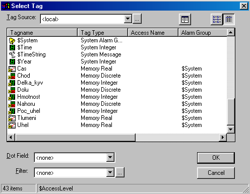 Obrázek 3-2 Objekt TagBrowser pro výběr proměnných z aplikace “Kyvadlo”