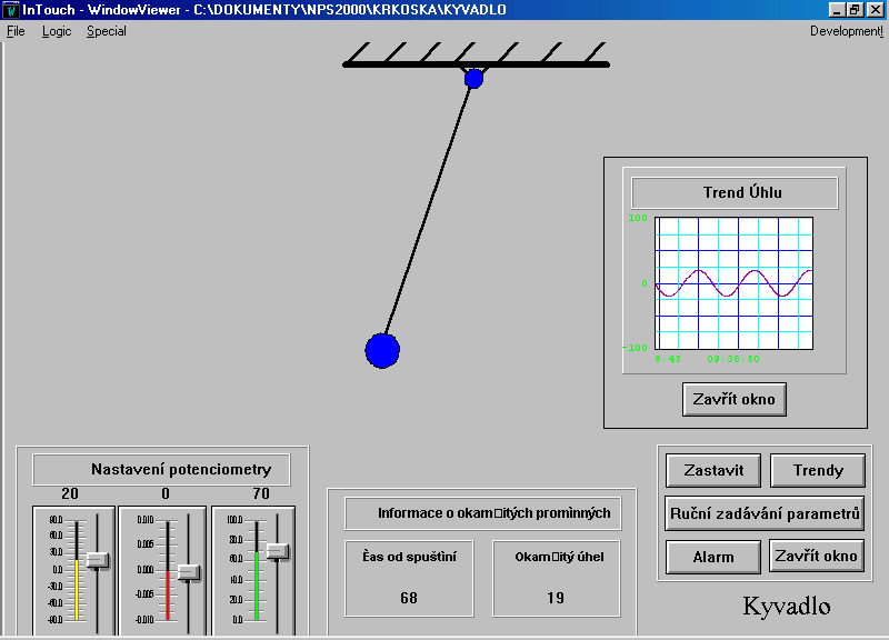 Vizualizace tohoto modelu je provedena v aplikaci s názvem “Kyvadlo” tak, aby ji bylo možné spustit i demoverzi modulu InTouch 7.0 bez hardwarového klíče.