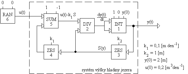 Ukame si nyní sestavení simulačního modelu systému výky hladiny jezera, který byl popsán rovnicí (4.4). Nejprve sestavíme bloky, které vytvoří hodnotu pravé strany rovnice. Tak získáme hodnotu derivace výky hladiny. Tuto hodnotu budeme integrovat, čím získáme hodnotu výky hladiny. Celý simulační model je na obr. 4.2 {soubor JEZERO.SIP}. Jako vstupní veličina je přiveden jednotkový skok polohy (Heavisedeův skok), řeením modelu pro čas t = <0; 200> [den] získáme přechodovou charakteristiku systému, viz obr. 4.3.