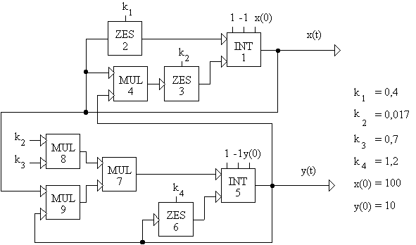 Často pouívaným je model systému kořist - dravec ( co je zjednoduená aplikace kapitoly systém příjmu potravy ), viz obr. 4.26. Předpokládáme, e kořist má neomezený přísun potravy a dravci se iví jen touto kořistí. Jedná se o dosti podstatné zjednoduení, ale jak si ukáeme i tak můeme učinit řadu zajímavých zjitění.